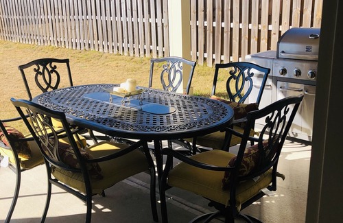 The backyard has a patio with outdoor seating for six, a 5 burner grill, and a bar. The backyard is fenced for your privacy.