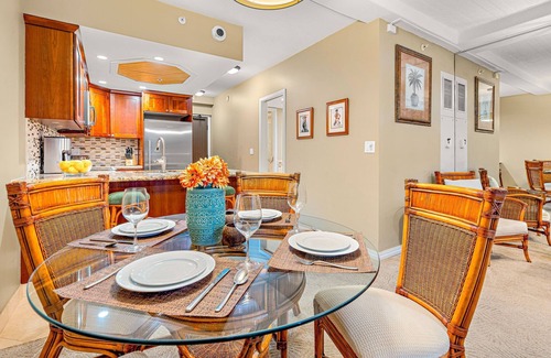 The beautifully upgraded kitchen, equipped with sleek granite countertops, custom wood cabinetry, and premium stainless steel appliances, invites you to prepare delicious meals or a refreshing drink. Dine in the cool comfort of the air-conditioned dining area or out on the spacious lanai overlooking the turquoise-hued ocean.