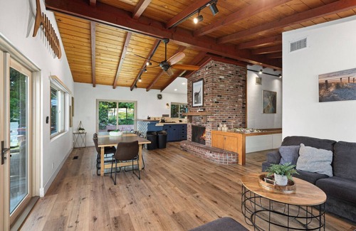 This is an ideal place to come together or enjoy your own space with 3 living rooms, several outdoor patios, a large balcony, and a deck. In addition, there's a large outdoor enclosed game room with a pool table, ping pong, and foosball. There's a variety in types of bedrooms including: two large master suites with private bathrooms, three cozy single or couples rooms- two of which have a built in-room vanity for getting ready, two bunk rooms with 4 bunk beds in each. The house meets the needs of every kind. There is also ample parking in the driveway for over 10 cars. The kitchen has views to the yard with a lawn and deck. The main room is an open concept with the kitchen adjacent to the large dining table that sits right next to he fireplace and living room. With vaulted wood ceilings the dining room and living room are open and bright with ample natural light. French doors open up from the living room to a viewing balcony to relax and soak up some of the best weather and views in all of San Diego!!