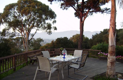 Located in private Hope Ranch community, this 4000sqft exceptional 2-story home with wood and marble floors, high ceilings, custom-made windows give each room abundant natural lighting. Gorgeous mountain views from the living and dining room as well as from the kitchen and the 500sqft outdoor deck. Situated at the end of a cul-de-sac street, 15 minute walk to the beach, exceptionally quiet, you can listen to the many beautiful birds and watch the red-tail hawk soar above you. Surrounded by 1.7 acres of garden with fruit trees, roses, hibiscus, bougainvillea, cacti and native California plants. A 50 foot private lap pool invites you to swim or relax on the pool deck with a good book. The house is furnished with mostly European furniture and you will feel seduced by the charm of each room. 360sqft master bedroom with balcony and beautifully tiled master bathroom on the second floor, 3 oversized bedrooms (1 BR with king bed, 1 BR with king bed and twin bed, 1 BR with full bed) with two large bathrooms on the first floor. There is a shower room accessible from the outside of the house when you come back from the beach or pool. A separate TV/reading room is adjacent to the living room with its own private outside deck. The owners are music lovers, there is a piano in the living room and a great selection of classical, French and Latin American music recordings for your enjoyment. Private driveway with 3 car garage. Cable TV, Wifi included.