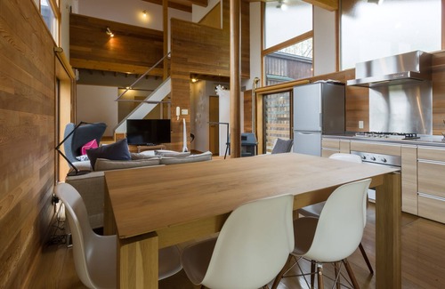 Our Contemporary Alpine Cottage is 500 m. from Hanazono Ski Resort (powder snow playground in winter) and adjacent to a fine golf course for summer. It is fully furnished and equipped with everything you need in a cozy mountain retreat, incl. a small modern kitchen and fully renovated new bathroom. The interior is warm and light filled with high ceilings, cedar wall panels and a "floating roof" effect. Wonderful view of Mount Weiss, from a quiet enclave. Great for one or two couples or small families.