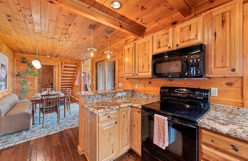 This inviting mountain home offers plenty of room to relax and unwind. The main living area features an open layout with a cozy gas log fireplace and comfortable seating, perfect for gathering after a day of exploring. The kitchen is fully equipped with an oven, stovetop, microwave, dishwasher, refrigerator, freezer, coffee maker, electric kettle, and toaster, along with complete cookware, dishware, and utensils.