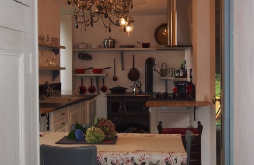The kitchen is both old and modern. The log burning range is wonderful in winter months but the modern inset electric oven and gas hob more practical for other times of the year. There is a dishwasher, fridge, kettle, toaster and coffee maker and sufficient kitchen paraphernalia to keep most cooks happy. The dining table and chairs seat four very comfortably.