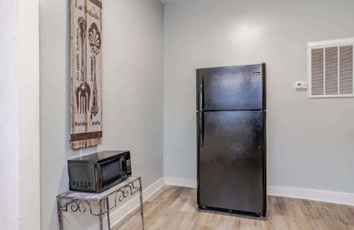 This apartment is the first apartment in a converted historic home with four apartments. There are three bedrooms, one with a king bed, one with a queen bed, and another with a full. You will also find a futon in the living area. There is a full kitchen with basic and essential amenities. We provide all of the essentials whether you're traveling for work or business. This is the perfect place for business or pleasure! Complete with a dining area to enjoy meals at home, and a smartTV to tune into your favorite binge-worthy show! Just enough room for a couple with kids and a pet!