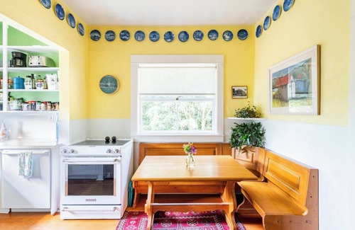 Each room has been lovingly appointed with antique Scandinavian modernist as contemporary farmhouse furnishings. Pacific Northwest artwork graces the walls. There is a story behind each. If curious, just ask! The porch has two very comfortable vintage adirondack style chairs, a foot rest, small table and a porch swing. For vacation or for work, Mint Julep provides. Share a romantic meal while sitting out front and watch the world go by. The living room has my grandmother's original (!!!) Danish couch and chair, a large Roku television, and a terrific gas fireplace. Want some hygge, anyone? The dining room can be your work-from-home headquarters by spreading out on main table with its full garden view or the kitchen nook. The wifi is zippy so no worries there. Bedroom 1 has a king size bed and en-suite walk-in bathroom (accessible for all ages and abilities). Both bathrooms have heated floors should you like, and grab bars for safe entry and exit. Bedroom 2 has a queen mattress with a neighboring tub/shower combo and a Roku tv. Both bedrooms have generous closets and luggage racks to keep things off the floor.