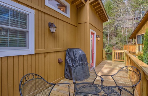 Located on the shore of Mirror Lake and just one mile from Main Street in Highlands is Mirror Lake Red Door Guest House. Our guest cottage is a cozy cottage that has been recently remodeled with all the amenities you need for your visit to Highlands. Our den features a wood burning fireplace with a gas starter. Our bedroom overlooks beautiful Mirror Lake with breath taking views. Our kitchen has a gas stove, microwave, dishwasher, refrigerator, coffee maker, china service for 6 and flatware service. Our cottage also comes complete with a washer/dryer. Flat screen televisions are located in the den and bedroom with cable service. Wifi is also in the house so you can stay plugged in if you like. Our cottage has a nice deck located on the side of the house with gas grill, outdoor seating and a small table. Our deck has beautiful views of Mirror Lake. All of this and just one mile from Main Street!
