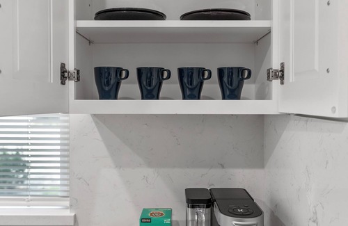KITCHEN/DINING AREA: Gas Stove | Dishwasher | Keurig Coffee Maker| Water Kettle | Fridge | Pots & Pans | Cooking Utensils | Silver ware | Dining ware | Coffee | Sugar | Creamer
