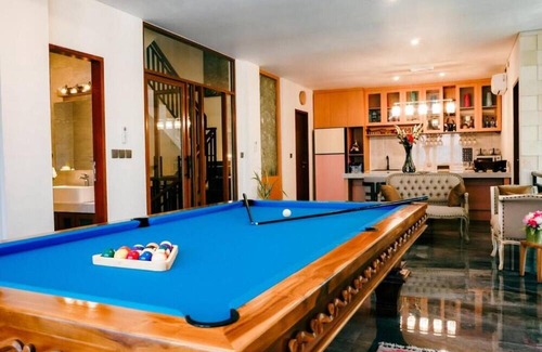 Guests can relax by the private pool, take in ocean views from the rooftop lounge, or enjoy the villa’s many entertainment zones including a snooker bar, roof-garden, yoga studio, and a kids’ playroom. Each of the 5 ensuite bedrooms comes fully air-conditioned with elegant furnishings and modern bathrooms — two featuring Jacuzzi bathtubs.
