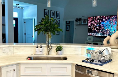 Living room has a large U-shaped sectional sofa with two ottomans, 85-inch Sony BRAVIA TV with surround sound and complimentary Netflix. Screened in back porch and a back patio with shade tent inside the fenced-in backyard. Master bedroom has a queen bed, cathedral ceiling, and 4K wall-mounted TV. Second and third bedrooms have full-size beds. Master bath has two sinks, walk-in ceramic tile shower with two shower heads, including a "rainfall" shower head. Kitchen is equipped with the latest Samsung appliances: fridge, gas range with air fryer, microwave, dishwasher, washer/dryer. Keyless entry. Protected by ADT.