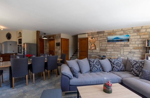 A very comfortable cottage, in the heart of the Southern Vosges destination, close to the spa towns of Plombières les Bains, and Luxeuil Les Bains 8 km, and the air base. Discover the Plateau of 1000 ponds, numerous hiking, mountain biking, fishing... For children: St Valbert animal park, Ecomuseum of the Cherry country ... To do: Casino, Distilleries and Kirsch de Fougerolles AOC. The cottage "Le Saussis" offers you all the comfort of a modern cottage and the charm of stone, leisure and well-being facilities for a guaranteed relaxing stay! Leave with peace of mind, the beds are made upon your arrival, towels are provided, as well as bath towels for the pool and jacuzzi... in short, relax, it's a real vacation at Le Saussis! The cottage comprises on the ground floor a very beautiful living room with equipped kitchen, living room with flat screen TV and fireplace with wood insert, dining room, giving access to the terrace and the private swimming pool. The large bay windows offer you superb brightness and a lovely view. WC on the ground floor. Upstairs, by 1/2 level, 1 bedroom (1 bed 160/200), 1 bedroom (1 bed 160/200), 1 bedroom (1 bed 140/190), bathroom with bathtub, shower cubicle and double sinks. On the second 1/2 level, a bedroom (1 bed 160/200) with flat screen TV, large cupboard for storage, a bathroom with shower cubicle/WC. Air conditioning in each bedroom and living room. Annex: 6-seater indoor jacuzzi (optional with an additional €150/stay), private heated swimming pool (8 m x 4 m) open from May to September, fitness area (indoor bike). Badminton net. Cleaning fee €90.