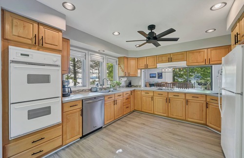 Home includes a private dock, gym, outdoor deck, grill, indoor fireplace, hot tub, and a basement game room. Four spacious bedrooms with a queen murphy bed in the loft.
