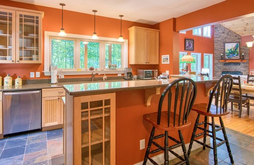 An exceptional stay awaits when you book this mountainside log cabin. Boasting a wide open layout with vaulted pine ceilings and large windows, this home also includes modern appliances, a piano, and a rock gas fireplace in the main living space. After fishing down at the creek, come back inside to watch a good ballgame, movie, or show on the large TV in the living room. The full kitchen is equipped with stainless steel appliances and plenty of counter space to help the group chef turn out a wonderful meal. Serve your dinner guests at the dining table with seating for six while the kids swing their feet from the two breakfast bar stools.