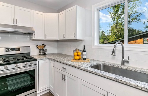 This one-level home sleeps 12 with a large gathering space and an open modern floor plan. Everything is brand new as it has been completely redesigned for comfort. Eat outside on the deck under the trees, take a soak in the hot tub, and enjoy the quiet residential neighborhood or short drives to national forests, breweries, and downtown Asheville and Hendersonville.