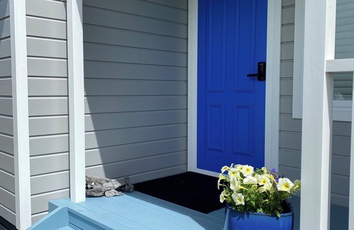 The Blue Door is beautifully decorated with interesting art pieces. The main bedroom has a queen bed and a wall mounted tv. There is a set of bunkbeds in the second bedroom. The kitchen is modern with everything you need to cook up a storm if you so desire.