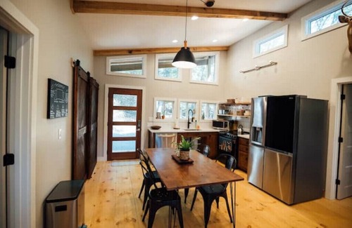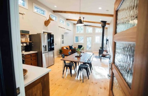 This two-bedroom and two-bath modern cabin sits on 6 wooded acres. The cabin is located at the end of a short paved driveway with easy access and plenty of parking. *There is a ramp for wheelchair/limited mobility access.*