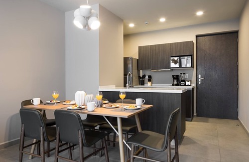 Experience a unique stay in this modern and sophisticated apartment with luxury finishes and professionally decorated, equipped with everything you need for a hassle-free stay. Its main attraction is the beautiful views of the iconic mountains of Monterrey; enjoy them on its spacious balcony with seating space to relax. It features a fully equipped kitchen, dining area, living room with a sofa bed, and Smart TV for Netflix enjoyment, as well as high-speed Wi-Fi access for uninterrupted work.