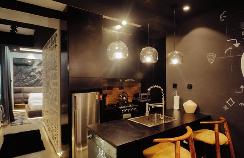 The bedroom strikes a balance between masculine and feminine energy, with a custom rocky headboard that symbolizes the inner strength we need to navigate our emotions. Dark crystal chandeliers add a touch of magical glitter, creating a space that feels both powerful and serene. We decided to infuse mauve sheets to tone it down to make it more metro. We understand that you will love to play hard while you work so we added a workstation so that you can stay in touch with the “bag”