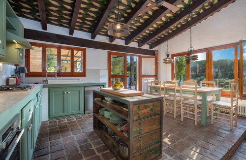 It is located in a privileged environment, in the center of the Costa Brava, surrounded by fields, pine forests, holm oaks and olive groves and at the foot of the mountains of “les Gavarres”. It is an original stone construction of the area, clay floors baked in wood ovens and native wood beams. The large arcaway windows, which are located along the entire facade, offer magnificent views of the fields of the property and allow full communication with the nature outside, the gardens and the pool