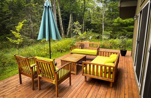 The porch looks out into the forest and a small creek. We have outdoor lights, patio furniture for a large group to sit comfortably and umbrella for lounging in the shade.