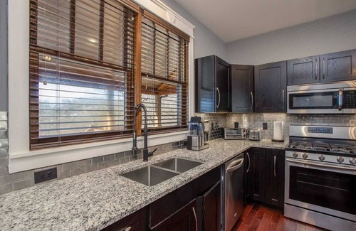 The main level features an open floor plan, starting with a well-appointed kitchen, granite counters, and stainless appliances. The central banquet-style dining table seats up to eight (8) guests together. The Great Room features soaring vaulted ceilings and wood floors, leather furniture, a gas log fireplace, and an HD Smart TV. A half bathroom and laundry room with a washer and dryer are on the main level. The impressively large porch spans the entire front of the house and even wraps around both sides. It provides expansive outdoor space for relaxation while taking in the layered mountain views, grilling out on the gas grill, or dining at the large picnic-style outdoor dining table.