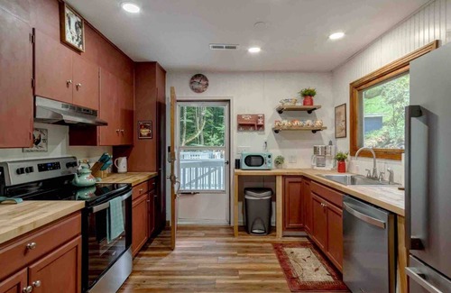 The living room has tons of seating including a brand new queen sleeper sofa with a memory foam mattress, and Roku tv so our guests can stream their favorite shows. There is also a set of sliding glass doors that lead to a small deck facing the creek. From the living room, travel up a small flight of stairs which opens into the fully stocked kitchen and dining area as well as a hallway to the bedrooms.