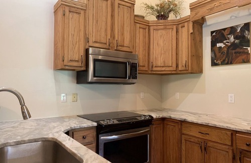 The amenities of the home will keep you more than comfortable too! The spacious home is like 2 homes in one, with even 2 kitchens. The main floor is ground level with no stairs to enter the home. On this main floor is a 1/2 bath, master suite w private en suite w tub & walk in shower, large kitchen, living room with real wood burning fireplace, & even a custom made farm table from a maple tree on the property. Also, plenty of pantry storage for your groceries.
