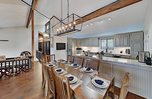 Unwind into vacation mode on the sofa and armchair in the living area. Cozy up by the wood-burning stove and watch shows on the 55-inch smart TV. Gather for a movie in the bonus living area, featuring a sectional (which converts to a sleeper), two armchairs, soaring vaulted ceilings, a wood-burning fireplace, coffee station, a 65-inch smart TV, and an arcade game. Prepare dishes in the gourmet kitchen, equipped with granite countertops, a farm sink, and a full suite of stainless steel appliances. Gather for meals around the dining table. Extra perks include complimentary WiFi and a washer/dryer.