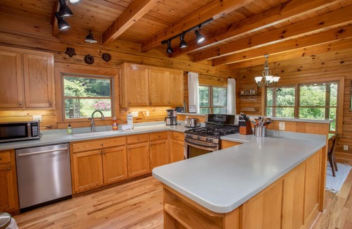 The main level offers a great room with mountaintop and pastoral valley views, soaring vaulted tongue-and-groove ceilings with exposed beams, hardwood floors, a gas log fireplace, and comfortable furniture that invites conversation and connection. A large armoire holds various games, puzzles, and cozy throw blankets. The adjacent open kitchen has stainless appliances, a gas cooktop, custom wood cabinets and is fully-stocked to delight the vacationing gourmet cook. The large dining table comfortably seats up to 10 guests. The pantry is just off the kitchen, complete with a high-efficiency washer and dryer and supplies for your canine companions.