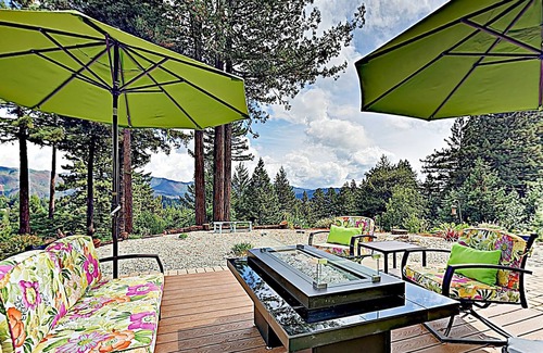 Contemporary furnishings and rustic-chic details come together at this updated three-bedroom home to create a unique mountain retreat surrounded by redwoods. Hike lush parks and forests in the area. Two large decks outfitted with comfy furniture and gas firepits create an unbeatable vantage point from which to enjoy the magnificent mountain views.