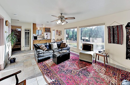 The living area is furnished with a sofa, love seat, and armchair. Watch favorite shows on the flat-screen TV. The large windows perfectly frame the rolling mountain vista.