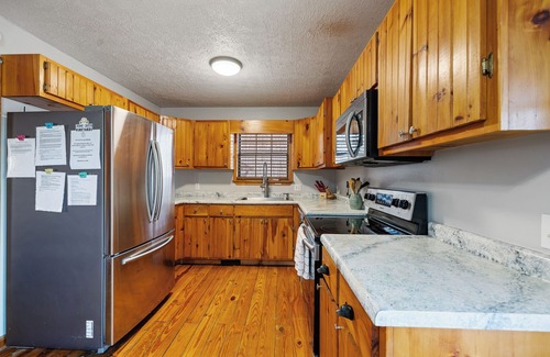 Indulge in the comforts of home with the cabin's thoughtful amenities, including a fully stocked kitchen, a cozy fireplace, and a convenient washer and dryer. Enjoy quality time with your loved ones in the spacious living room, or challenge them to a game of ping pong in the dedicated game room.