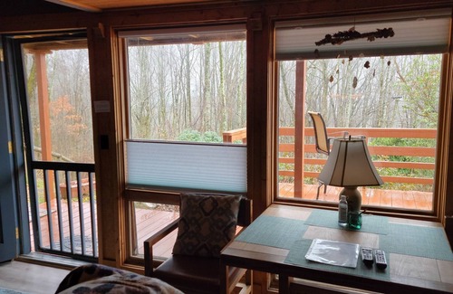 Nestled sweetly in an enchanted forest rests this adorable cottage overlooking a beautiful garden from it's own private deck. The entire downstairs is yours to enjoy. You'll feel immersed in nature looking out from the floor to ceiling windows throughout. The space wraps you in comfort and reminds you of a simpler time where the chaos of life slips away. The house is situated perfectly on a gradual slope with a lovely view. My parents lived here for some thirty years. Being in the mountains of North Carolina, we around 4000' in altitude making for cooler mornings and evenings even in the summer. The top floor is the main part of the house where I live, and the lower floor is a one-bedroom apartment with queen bed, full bath, kitchenette, and living area. Your space has it's own entrance from a deck with an umbrella table and chairs with a lovely view of the mountains to the west. The deck is surrounded by roses, a flower garden and overlooks the front lawn with gardens, a red maple and many beautiful large trees. It is completely private from the upstairs where I have a balcony also with a view to the west (and gorgeous sunsets in the fall).