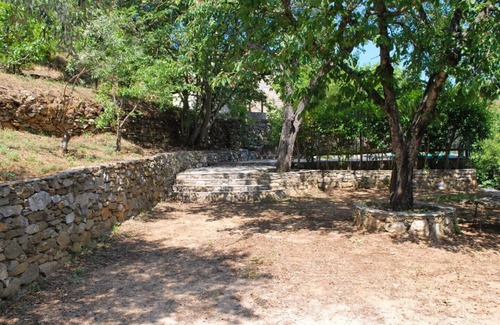 It has large terrace with mulberry trees and pergola to give shade, and wooden benches and table for outdoor dining. To one side is a stone built barbecue, and sink. A swimming pool is located below and close to the cottage with further gardens.