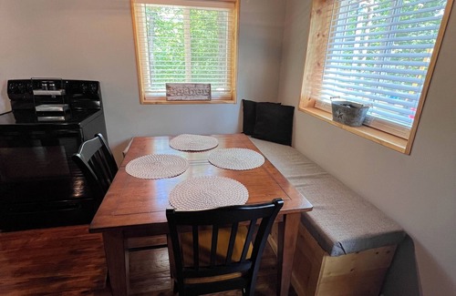 Relax with your family & friends in this peaceful cabin at Nolin lake. We are located past the Ponderosa Marina turn off on a private road. Our home has been completely remodeled with some finishing touches still being completed but we are ready to share it and for you to enjoy it. You can relax and truly enjoy nature from almost any view. You can access the lake via a short walk so bring your rafts, sunscreen and picnic basket. Our home has a private drive with steps down to a beautiful front deck. When you enter the front door experience an open floor plan. Our living room offers plenty of seating to kick back and relax. The kitchen has everything you will need to enjoy home cooked meals with a built in bench surrounded by windows to watch the wild life off the back deck. We have 2 bedrooms - one with a queen bed and the other has a queen bunk bed w/ twin on top. The bathroom has a shower w/ bench, fresh towels, soap, body wash, shampoo, conditioner and tp provided. There is a side door out to a deck that wraps around the back of home to truly enjoy mother nature. A very peaceful setting w/ outdoor furniture to sit and enjoy. We offer a gas grill and firepit for those campfire nights.