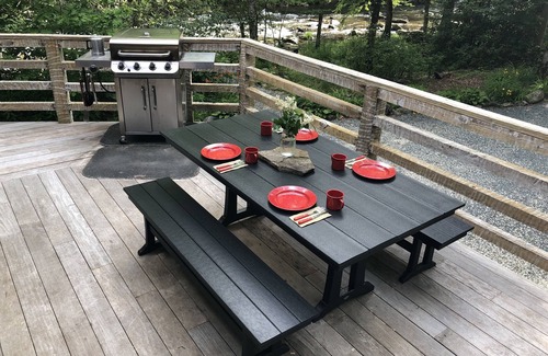 We custom designed and built our cabin with reclaimed wood from our family's North Carolina cabins and barn. Native stone was used inside and out. We furnished our home with handcrafted furniture and transformed family heirlooms into art. Every detail was carefully considered as we blended our family history into the creation of the Nantahala River Lodge. The Lodge offers accommodations for up to 8 people. Every room offers a view of the river. We encourage you to open the windows to bring the soothing river sounds indoors.