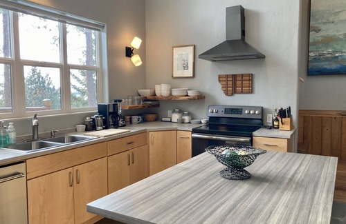 Nature House features two distinct sleeping areas depending on your mood and needs. Downstairs is a dark and cozy bedroom with a comfortable queen size bed and television. Upstairs in the loft, wake up to trees and dazzling lake views in the cloud-like king size bed and enjoy a cup of coffee and good conversation in the comfortable sitting area. Along with wireless internet and 50" televisions in the living room and downstairs bedroom, you’ll find a nice selection of books, music, and games for entertainment. And shuffleboard! There’s an 8’ shuffleboard table in the loft, for those guests with a bit of a competitive streak! A beautiful full kitchen looking over the lake, dining table for 4-6, propane grill and outdoor seating, and a stock of basic spices, oils, and condiments, make cooking at home delightful and easy.