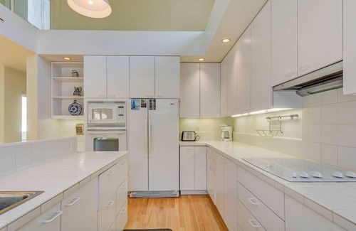 Neel Nirvana is tastefully decorated with selected pieces of antique furniture and antique Persian rugs. On the first floor, glass wall panels create a sunny room to relax in. A table set and lounge chair in the sunroom face a rose garden. A washer and dryer are conveniently equipped, handy for any swimsuits. An elegant white kitchen is prepared to help the chef cook anything from tasty snacks to mouthwatering meals or head to the side patio for the propane BBQ grill.