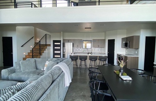 For your comfort, this modern two-story lodge, includes two primary bedrooms on the first story. Each one of these bedrooms has a king size bed, big screen smart TV, private bathroom, and access to the back patio. The second level includes a loft area with a queen sleeper sofa and one bedroom with a queen/twin combo bunk bed. Each area has a big screen smart TV, and a shared adjacent bathroom. The most spectacular views can be captured from the second story outdoor balcony, accessible from the upstairs bedroom. With 4 beds total, and a sleeper sofa, Scenic 7 lodge will comfortably sleep 9.