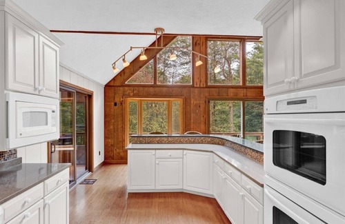 Get cozy in the living room, with large glass windows framing a serene view of the surrounding trees, bringing in plenty of natural light and a peaceful connection to nature. Watch a movie on the WiFi-enabled 85-inch SmartTV or stream your favorite shows on any of the popular streaming apps you know and love. It’s a comfortable, thoughtfully equipped space—perfect for relaxing after a busy day or enjoying a quiet afternoon in.