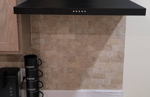 Fully stocked kitchen with microwave/air fryer combo, coffee maker, toaster, blender, and more