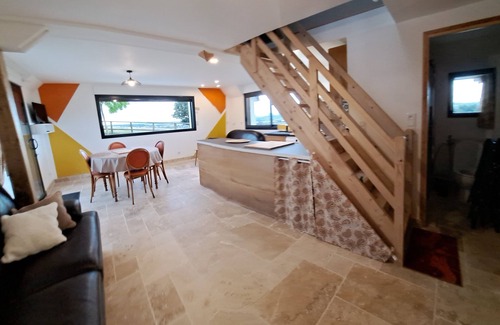 My accommodation is completely new and restored with quality materials and decoration. It is composed of a living room of approximately 35 m 2 in which you will have the pleasure of finding a living room and its two leather sofas, a very pretty kitchen, a dining area and a cocooning corner near the wood stove. The bathroom is composed of a shower, a toilet equipped with a shower head, a washbasin cabinet and its mirror. The upper floor is attic and gives way to a small mezzanine in which is the single bed and a small bedroom in the attic where is the double bed. The floor of the accommodation and the terrace are tiled with travertine and the upper floor is in solid parquet. On the terrace you will have at your disposal deckchairs, garden furniture and barbecue. €67 per night plus €20 per night for the third person and €40 cleaning fee for the stay. Minimum 2 nights. The accommodation is not suitable for children (dangerous garage descent).