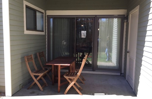 The kitchen was renovated in 2022- contains a stacking washer/dryer and comes with all necessary appliances and utensils - microwave, Keurig coffee-maker (bring your own K-cups), toaster and dishwasher. Off the living room through a large sliding glass door is a private patio with table, chairs and a two burner gas grill.