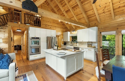 Escape to Western North Carolina at this picturesque log home in Sapphire Valley, NC. Surrounded by lush forests, this retreat offers access to Whisper Lake and Sapphire resort amenities. Enjoy seamless indoor-outdoor living with a two-story patio, outdoor fireplace, and meandering stream. Inside, relax by the fireplace or cook in the Chef’s Kitchen With three King en-suites, two bonus rooms with queen beds, and a pet-friendly policy, this home is perfect for families or groups. Book Bird’s Eye Lodge Today!