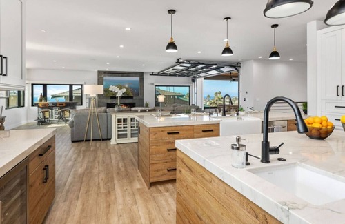 Have fun with the whole family at this stylish, modern, masterpiece. Enjoy the spacious four bedroom, 5 bath new home, complete with chef`s open kitchen, and plenty of luxurious spaces to unwind in. Enjoy the Sunset Cliffs ocean views from 3 distinct view decks ! Two BBQ areas and a gas firepit add to the dining experience. Huge open concept living room, dining and chef`s kitchen, wrap around an oversized flat screen TV and fireplace with more beautiful ocean views. Quiet, peaceful neighborhood.
