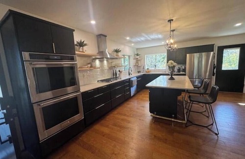 Kitchen is fully stocked with all the things to cook and entertain. Island seating for 3 and dining table seats 6.