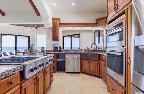 Inside the main residence, sliding pocket doors dissolve the line between indoors and out, revealing breathtaking views of the Sea of Cortez. The gourmet kitchen is outfitted with premium appliances and designed for cooking with fresh, local ingredients. Gather around the stunning live-edge Parota wood dining table, or unwind on luxury leather sofas beside the warm, modern fireplace.