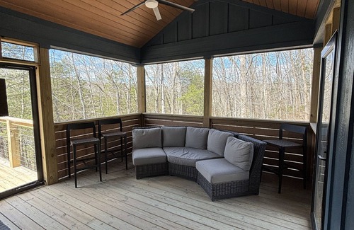 This beautiful home was just finished in January of 2024. It has a refreshing modern style with an open, inverted floor plan and soaring vaulted ceilings. The top floor includes a beautiful, bright living room, dining area, kitchen, plus an en suite with a full bathroom. From the kitchen, you have access to a large, cozy screened-in porch with a wood-burning fireplace and large flat screen tv, the perfect place for your morning coffee, quiet time with a book or to watch the game. Stepping out the wall of glass in the living room you’ll find yourself on a very large three-story deck overlooking the forest and pathway to the lake. This deck includes a large dining table and a smoker/grill as well.