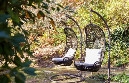 Our Signature Spa Suite with fireplace and sitting area offers a perfectly romantic escape to the mountains! Relax with a spacious sitting lounge, a freestanding tub by the fireplace and enjoy a private porch overlooking the garden. This suite is on the ground floor. Sleeps 2.