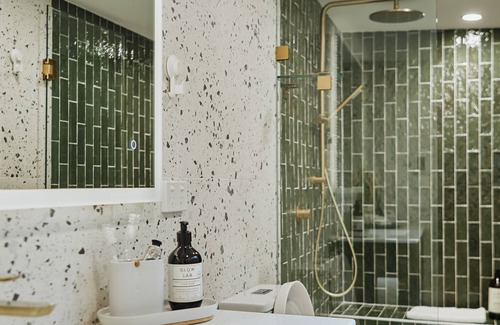 Once you enter the front door, you will enter the living room with a couch, followed by a fully equipped trendy kitchen. The kitchen leads to a cosy dining room connected to the bathroom, finished with beautiful terrazzo tiles and an olive-green shower room. All the finishes are in gold to increase the boutique feel. At the back of the house is a sun-drenched private courtyard - the perfect place to enjoy your cup of coffee.