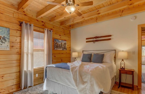 White Fir Adventures is a cozy log cabin that has been fully remodeled with many modern upgrades, including quartz countertops, farm sink, and stainless-steel appliances in the kitchen. The 24' vaulted wood ceiling in the front of the cabin and deck greets you to an open concept with a loft above the kitchen. The ground level includes two guest bedrooms, one with ensuite bathroom. While the downstairs may be cozy, the upstairs master suite is a spacious haven to relax and sleep well on a luxury memory foam mattress in front of an electric fireplace. The new master bath features a double vanity, tile shower, and glass enclosure. Enjoy the view of the mountains and a cup of coffee from the balcony. Above the garage is the fourth bedroom and sleeping space for a family, or a great place to put the kids (sleeping four in this room), with a full bathroom. The cabin is fully furnished with a rustic modern flare. The living room features a 46” HD smart TV and sound bar. Each bedroom has its own smart TV, all with Roku streaming devices that are easy to operate. The kitchen is completely stocked with all the essentials and more. If you are bringing work with you on your vacation, take advantage of the loft office workstation, high speed internet, and a printer. There is ample parking for a trailer to bring your toys. There is NO central A/C at this property, but there are high powered, ultra quiet window units with remotes located in the living room, master bedroom, and bedroom above the garage to keep guests cool in the summer.
